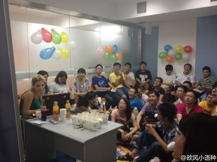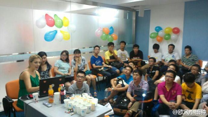 德語角活動的形式多種多樣,首先是歐風(fēng)的德語外教Kathrin給大家?guī)砹艘恍┰掝}的討論,比如:愛好。業(yè)余時間,德國國慶。。。等等。