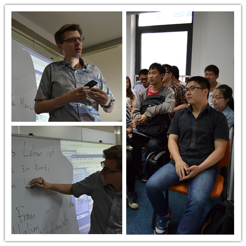 2012年5月26日下午14:00,歐風(fēng)德語(yǔ)角活動(dòng)在同學(xué)們的熱烈期盼中準(zhǔn)時(shí)開(kāi)始。德語(yǔ)角活動(dòng)的形式多種多樣,首先是歐風(fēng)的德語(yǔ)外教Herr Schwarz 給大家?guī)?lái)了一些話題的討論,比如:愛(ài)好。業(yè)余時(shí)間,德國(guó)國(guó)慶。。。等等。同時(shí)也就一些同學(xué)們所感興趣的話題和大家一起展開(kāi)討論。為了配合此次活動(dòng),歐風(fēng)小語(yǔ)種培訓(xùn)中心還準(zhǔn)備了多種多樣的禮物,獎(jiǎng)勵(lì)給那些在口語(yǔ)角當(dāng)中積極參與的同學(xué)。下圖是當(dāng)天活動(dòng)的一些掠影。