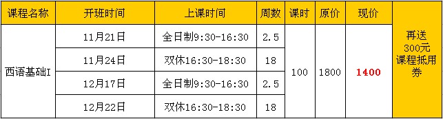 西語特價班,原價1800,現價1400,再送300抵用券,出國課程贈送2000留學基金,套餐立減300
