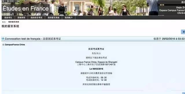 如果一切正常,兩天后你會收到郵件提示你去挑選場次。這個時候你再登錄Etudes en France 會看到付款情況變成:已確認。然后你就可以挑選場次。 建議大家挑選月末那周,因為那個時候有很多可以借鑒的機經,當然現在換題庫的時間也并不固定。 選完時間,就慢慢等待準考證。一直到你考試前一周,登錄Etudes enFrance,我的留言系統會有新消息,點開新消息,這就是你的準考證了。