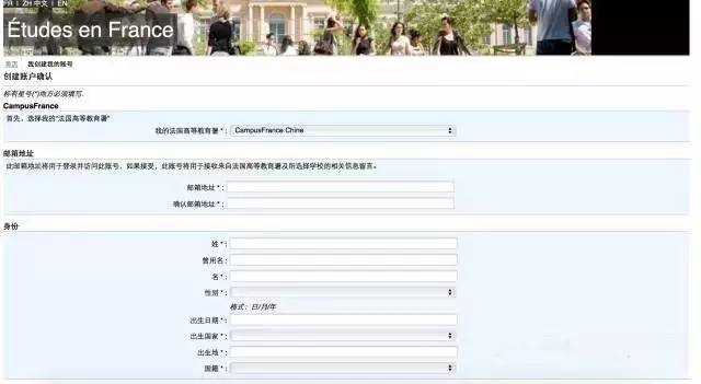 http://www.chine.campusfrance.org/zh-hans/ 請大家打開這個鏈接進入CAMPUS FRANCE。右上角可以把語言調成中文。請點擊右側Etudes en France,點擊頁面里的Je m'inscris 注意:考試需要注冊的是Etudes enFrance的賬號而不是Campus France的賬號之后考試涉及的各種都是跟Etudes en France有關系。Campus France 應該是涉及到學校選擇和簽證才會用。 點擊Espace Campus France Chine會跳出一下界面,這個時候請點擊左上角的ZH!然后就會出現下圖。