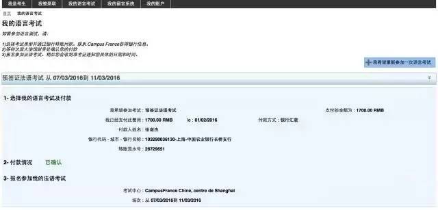 在這個界面里大家按自己的信息填就好,注意法國人日期是按 日/月/年 填的。證件類型我建議選身份證而不是護照。因為考場是要求身份證+護照+準考證(截圖打印即可)+照片的。 注冊完你會得到自己的CN號,這是你在這個系統中重要的標示! 接下來要去匯款。法語考試費用只能通過銀行匯款的方式支付,您可以到任何一家中國銀行匯款,匯款賬戶信息如下: 開戶人全稱: 法蘭西共和國駐華大使館財務處 帳號: 778350019317 開戶行: 北京的中國銀行總行 您同時還必須在您的匯款單上注明您的姓名拼音,Etudesen France注冊號,并且還要注明您所要參加的考試類型: TF PC (Test de FrançaisPré-Consulaire) – TCF complémentaire - TEF complémentaire – TCF DAP 例如 : ZHANG FAHAN CN12-34567 TF PC ZHANG FAHAN CN12-34567 TCF DAP 此項確認非常重要,如果您忘記填寫或者填寫不正確財務處將不能確認您的付款。. 您在選擇考試類型的同時還要選擇付款方式(目前在中國匯款是可選的付款方式).您所選考試類型相應需要支付的費用也會在您選擇完考試類型后同時顯示出來: • 預簽證法語考試 1700 RMB (從20多年1月13日起) • TEF 選考 1700 RMB (從20多年1月13日起) • TCF 選考 1700 RMB (從20多年1月13日起) • TCF DAP 1800 RMB (從20多年1月13日起) 匯款的時候切記問銀行要上“銀行代碼-城市-銀行名稱”&“轉賬流水號”,之后網上填信息需要。 匯完錢再次登錄Etudes enFrance到這個界面,點擊我的語言考試,然后點擊我希望創建新的語言考試。選擇“我希望參加考試”選擇預簽證考試,剩下的就按各自的信息填寫。當你都提交完以后,你刷新會看到付款情況:待確認。請耐心等待兩三個工作日。