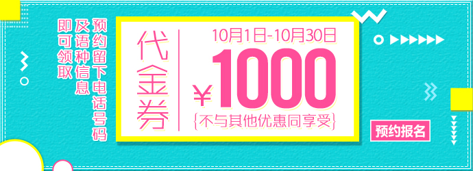 ![]() 網(wǎng)絡(luò)可以使用:10月1日-10月30日,預(yù)約留下電話號(hào)碼及語(yǔ)種信息,即可領(lǐng)取1000元代金券(學(xué)費(fèi)金額滿1萬(wàn)元使用),不與其他優(yōu)惠同享受 更多相關(guān)優(yōu)惠歡迎來(lái)電咨詢:025-83236520 (責(zé)任編輯:admin) |